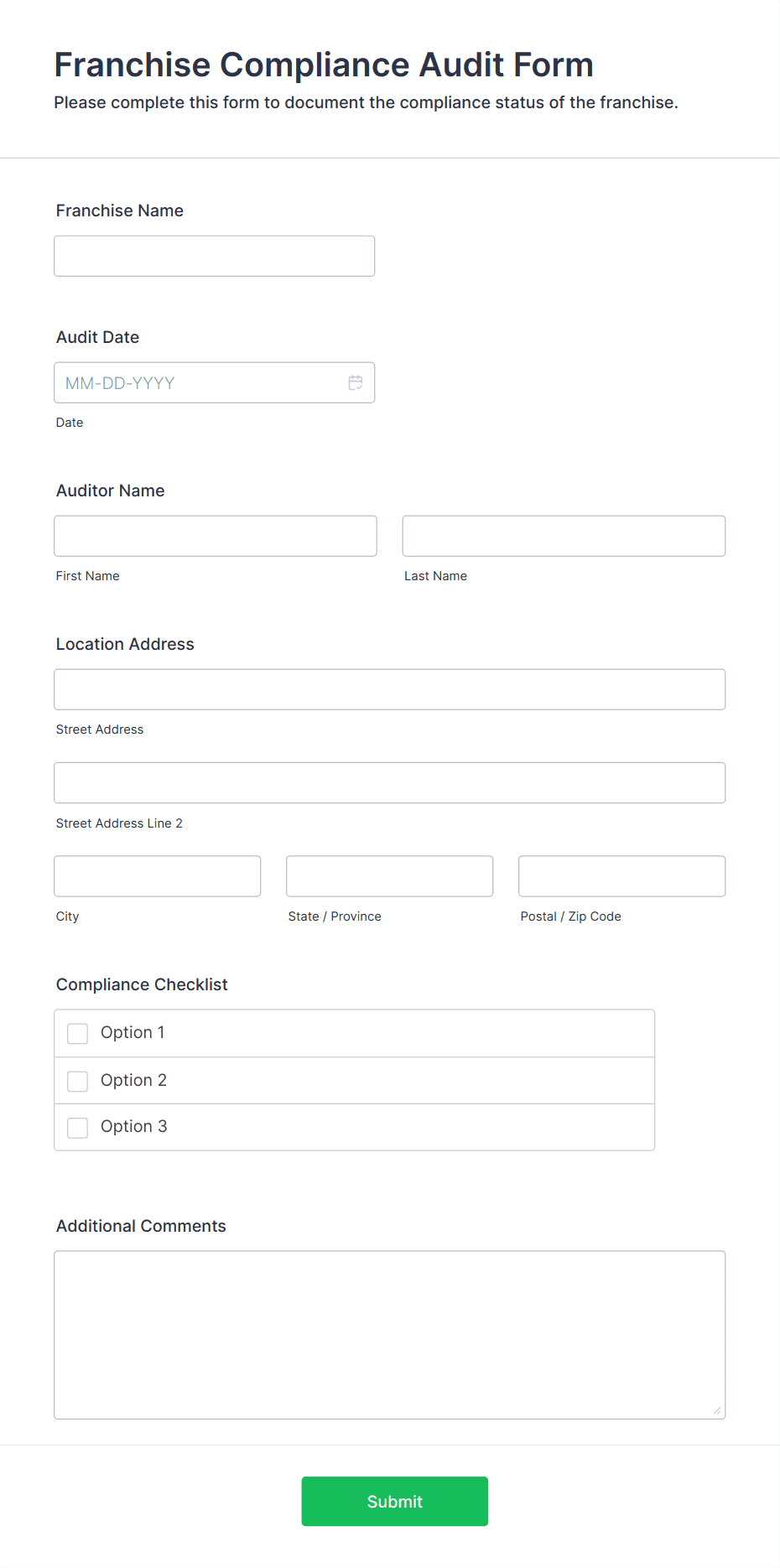 Common fields include auditor details, date and location, checklist items, compliance ratings, comments, corrective actions, signatures, and supporting documentation.