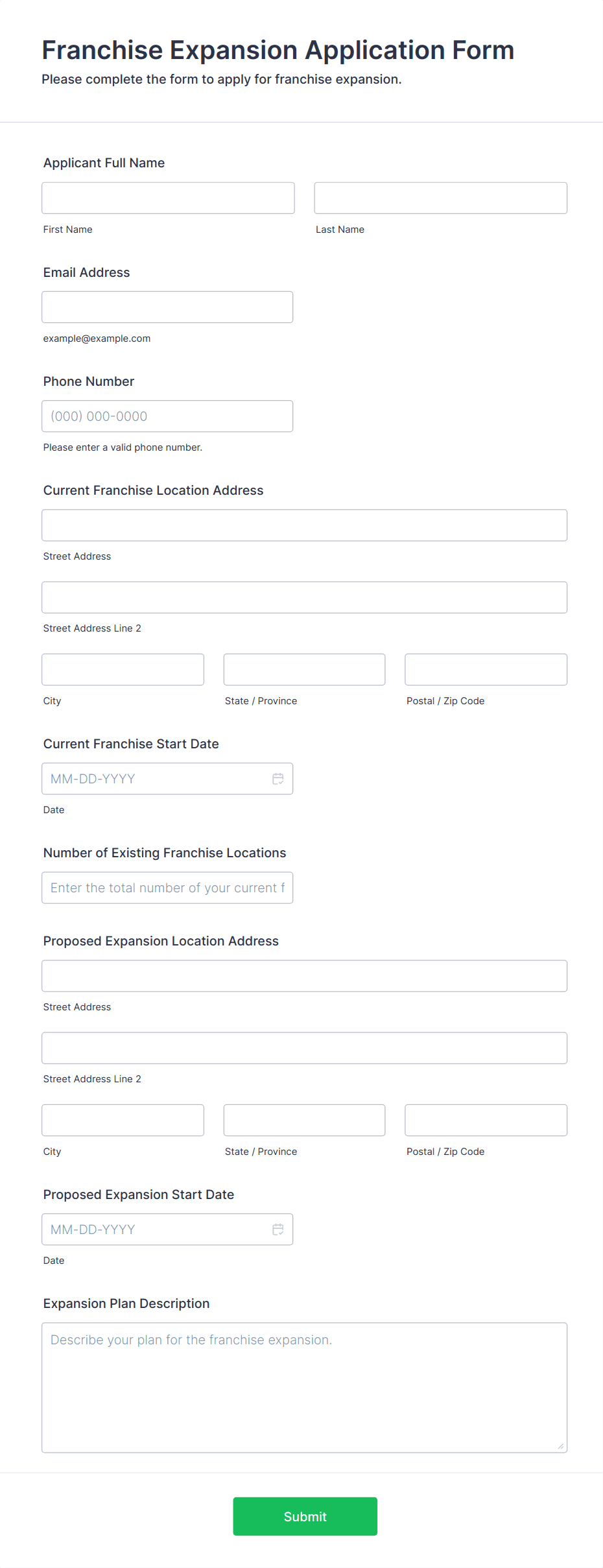 • For job applications, include fields for personal information, education, work experience, references, and file uploads for resumes or cover letters.