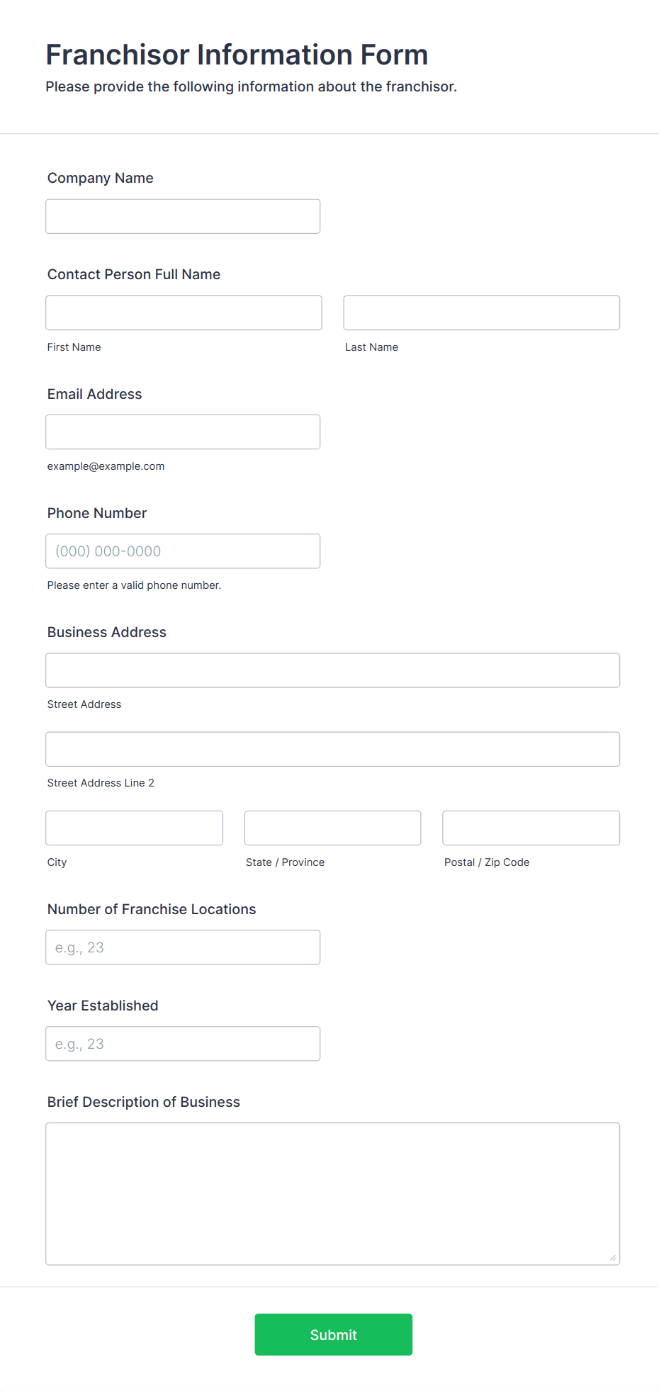 The form templates here are for informational purposes only. Jotform is not providing legal, financial, or other advice, or implying that the forms are legally valid in all or any jurisdictions. Before using any such form, consult an attorney and/or other applicable professionals to make sure that the form meets your needs, legally and otherwise.