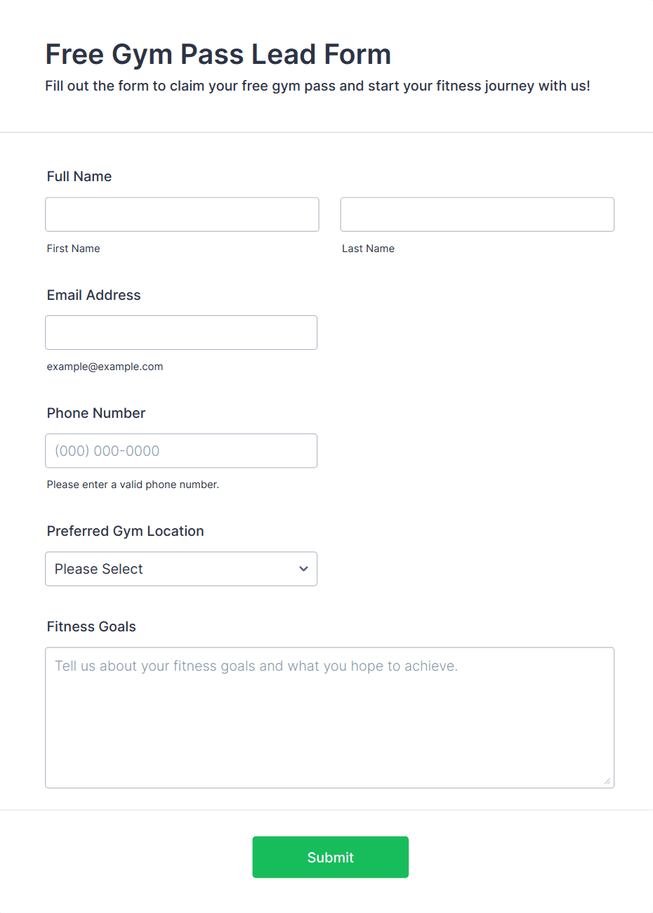 The information you collect depends on your goals, but common fields include name, email address, phone number, company, job title, and specific questions related to your product or service.