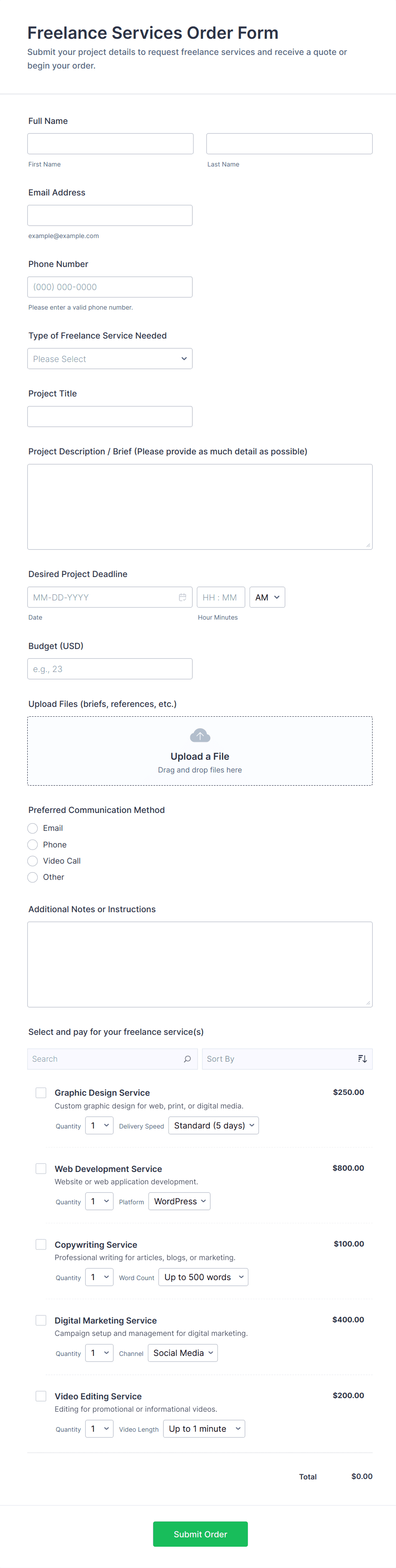 • For service orders, include fields like date/time pickers, dropdowns for service types, and text fields for special instructions.