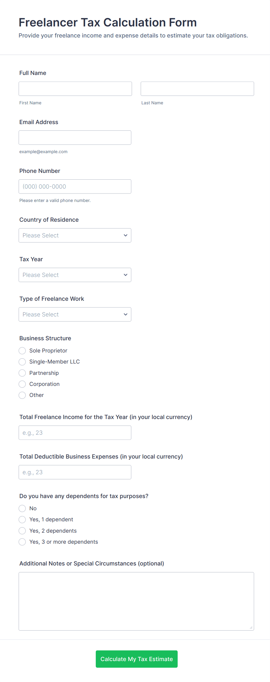 Free tax form template for self-employed US residents. Fillable on any device. Automatically saves responses as PDFs. Sync to 100+ apps. No coding required.