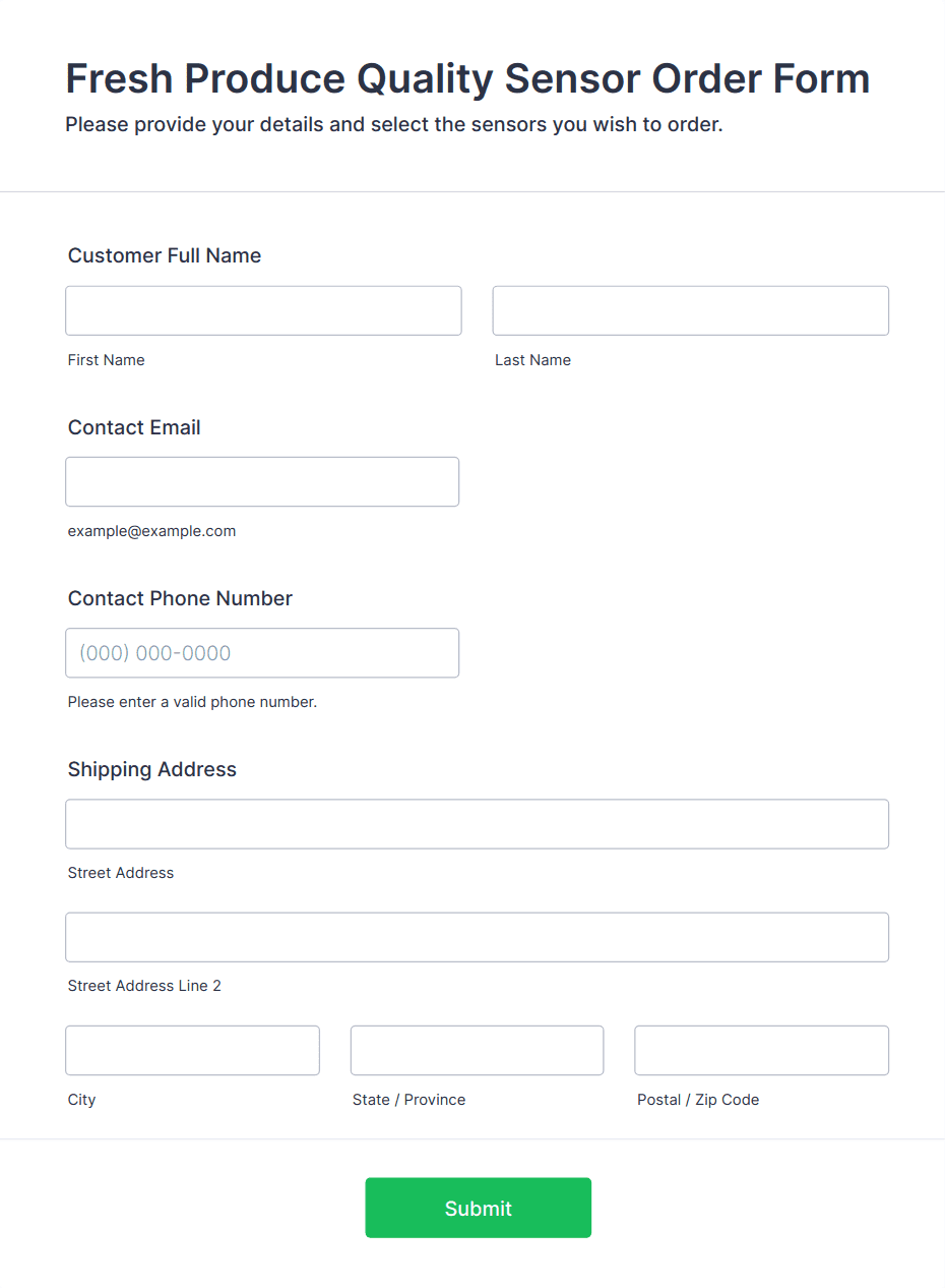 Typical fields include customer name, contact information, product selection, quantity, payment details, and shipping address (if applicable).