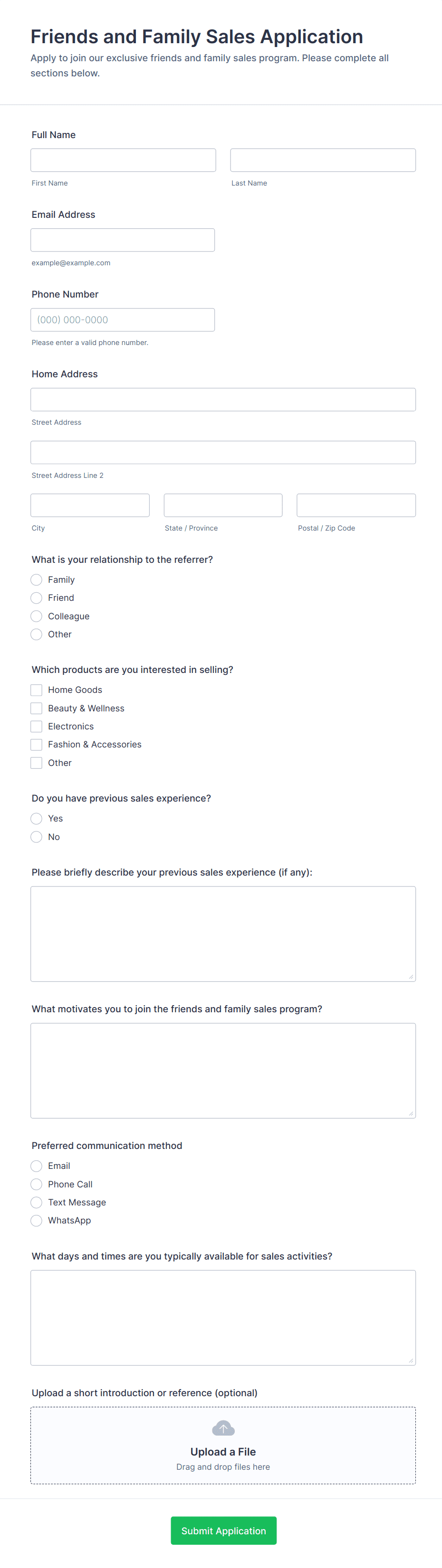 • For job applications, include fields for personal information, education, work experience, references, and file uploads for resumes or cover letters.