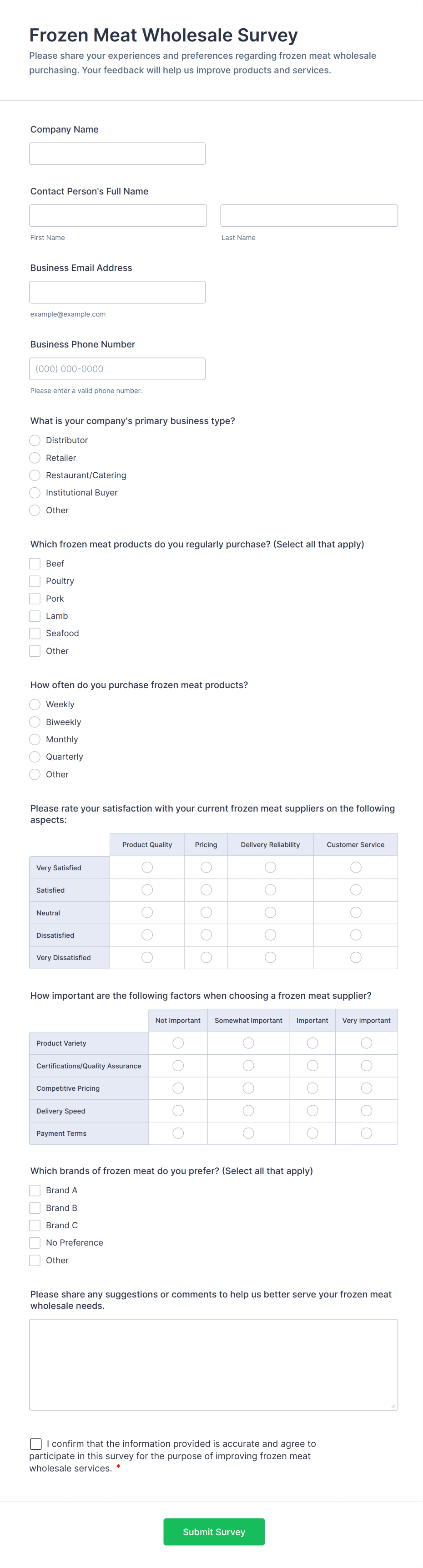 Product Survey Templates are pre-designed forms specifically created to help businesses, product managers, marketers, and researchers gather valuable feedback about products from customers, users, or stakeholders. These templates are used to assess customer satisfaction, collect suggestions for improvement, evaluate product features, and understand user experiences. Product survey forms can be utilized at various stages of a product’s lifecycle — from initial concept testing and beta launches to post-purchase feedback and ongoing product improvement. Common use cases include new product feedback, feature prioritization, usability testing, and post-launch satisfaction surveys.