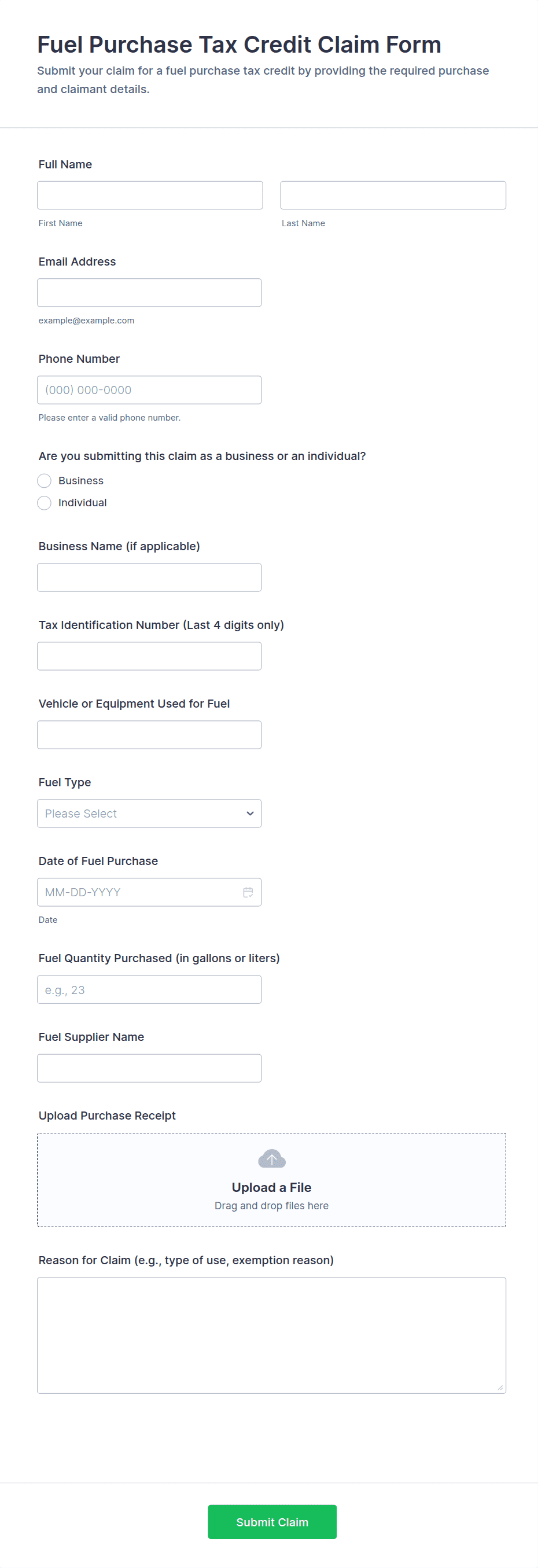 Common fields include personal or business identification details, tax identification numbers, income amounts, deductions, filing status, and supporting documentation such as receipts or invoices.