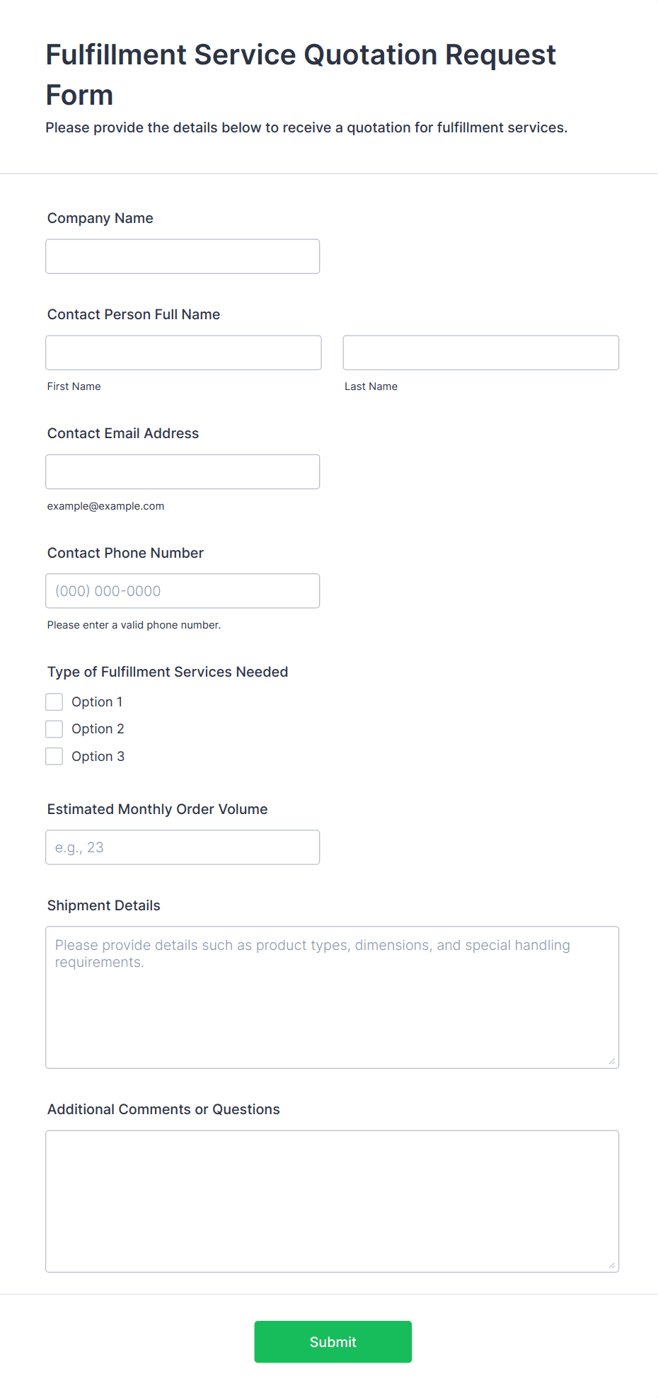 Typical fields include contact details, service or product selection, quantity, project specifications, preferred dates, and any additional requirements relevant to the quote.