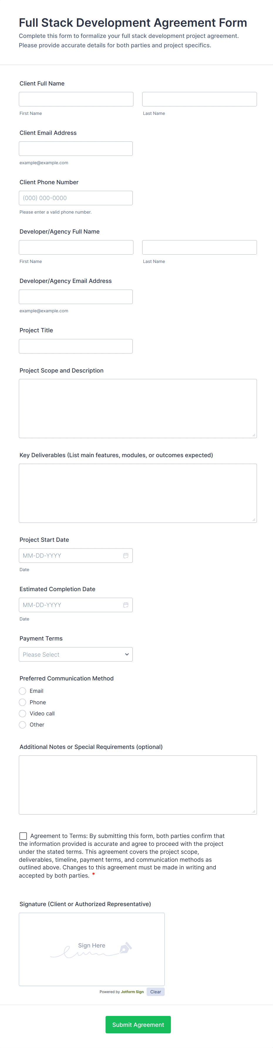 Use this Service Agreement Template and start receiving submissions for the creation of service contracts. Don't waste time building forms in automating your form submissions for receiving service contracts.
