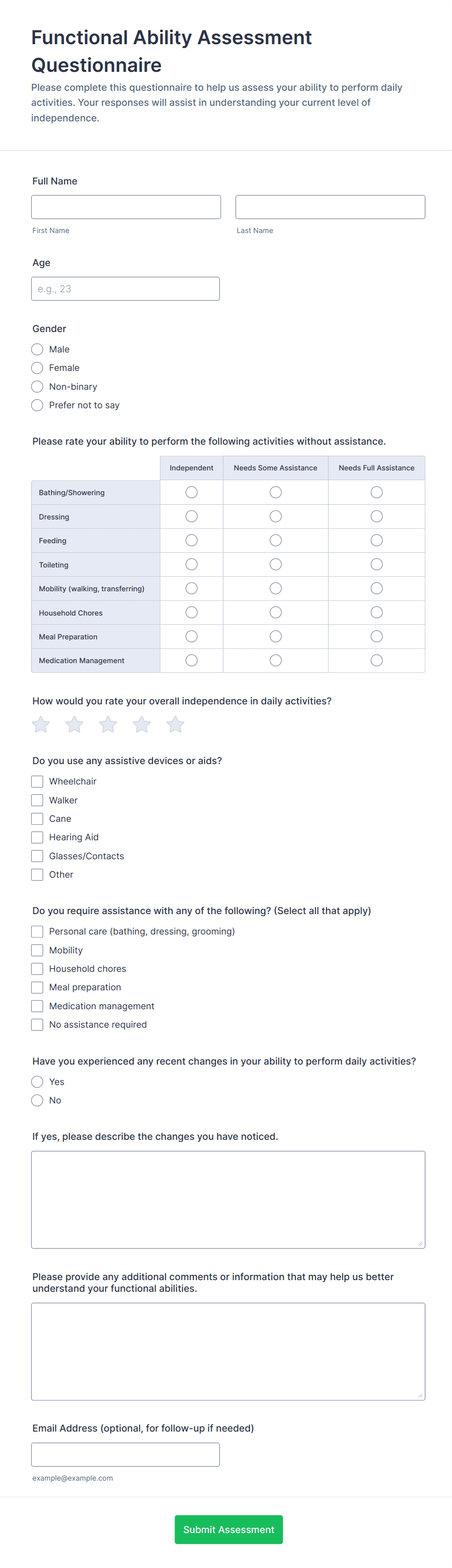 Add fields for symptoms, medical history, medications, allergies, lifestyle factors, and functional status depending on the assessment type. Use rating scales for severity and impact.