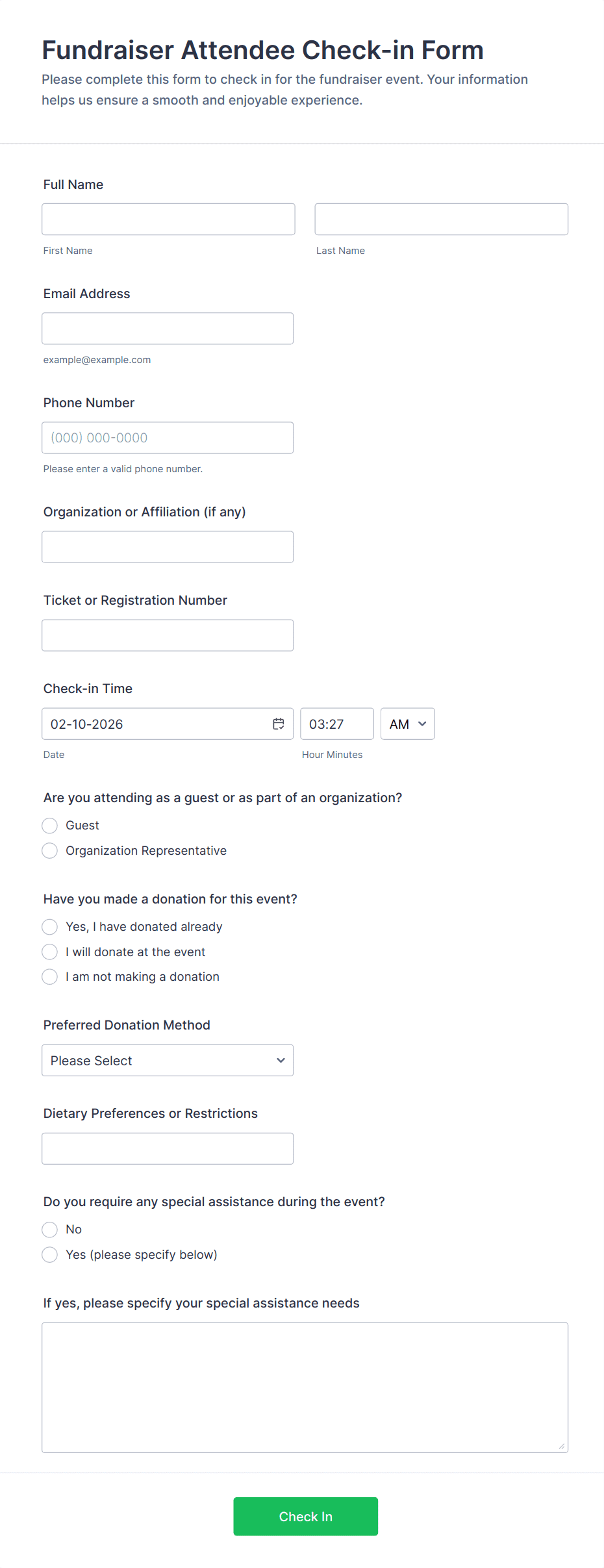 - Event Check-In: May include fields for ticket number, session selection, and special requirements.