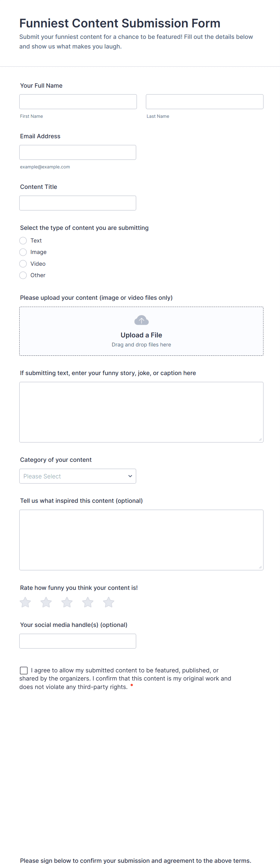 • File upload fields for photo, video, or document submissions.