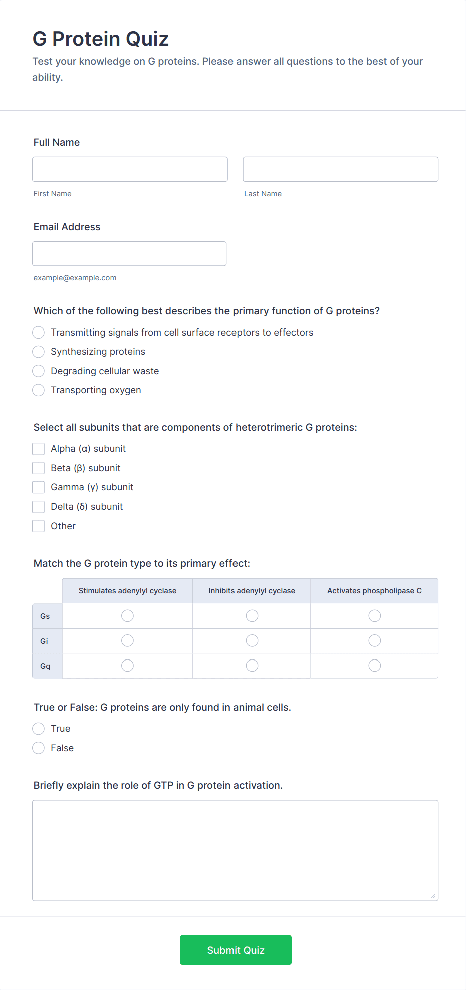 Quiz Templates are pre-designed forms specifically created to facilitate the process of building quizzes for a variety of purposes, such as education, employee training, lead generation, event engagement, and more. These templates provide a structured way to present questions, collect answers, and automatically score or evaluate responses. Whether you’re a teacher assessing student knowledge, a business running a product knowledge test, or a marketer creating a fun personality quiz, Quiz Templates offer a flexible foundation to suit your needs. They can be used for online exams, trivia games, onboarding assessments, customer feedback quizzes, and interactive learning modules.