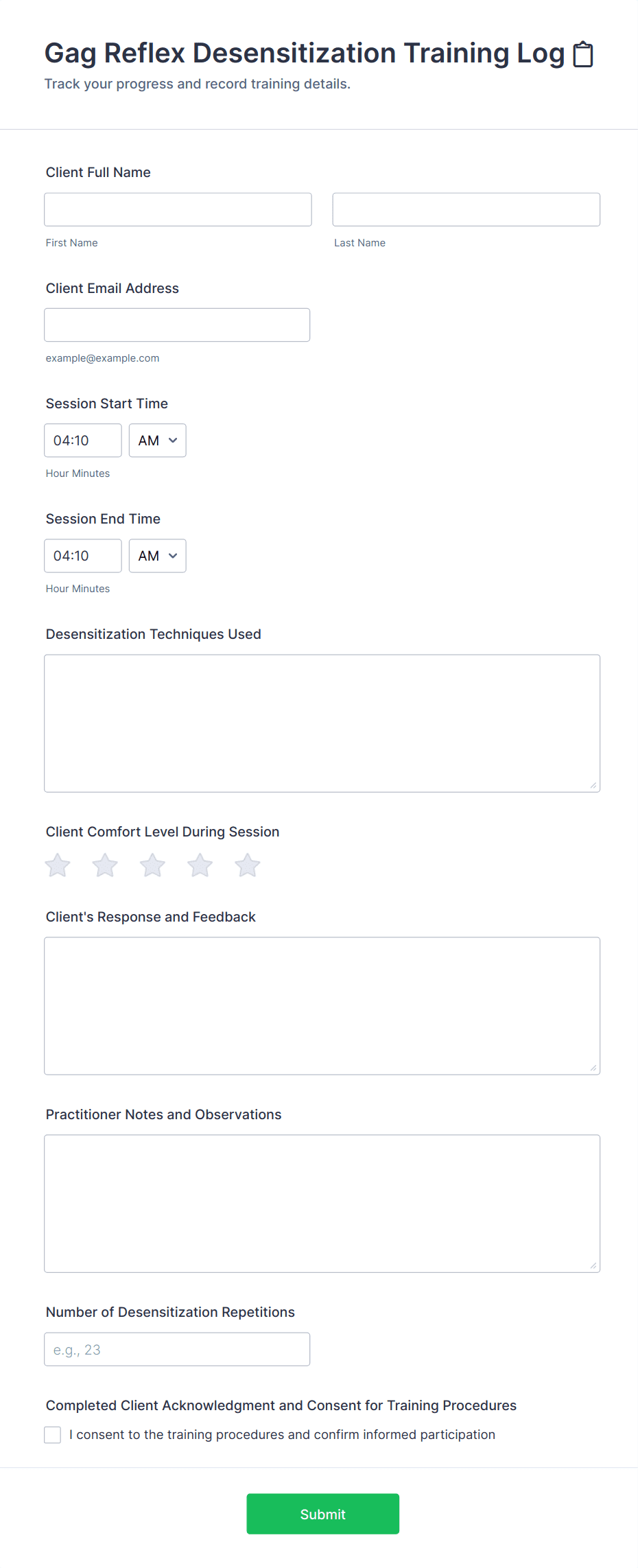 Gag Reflex Desensitization Training Log Form helps clinicians document therapy sessions, track client comfort and techniques used, and organize session records with an easy online template powered by Jotform.