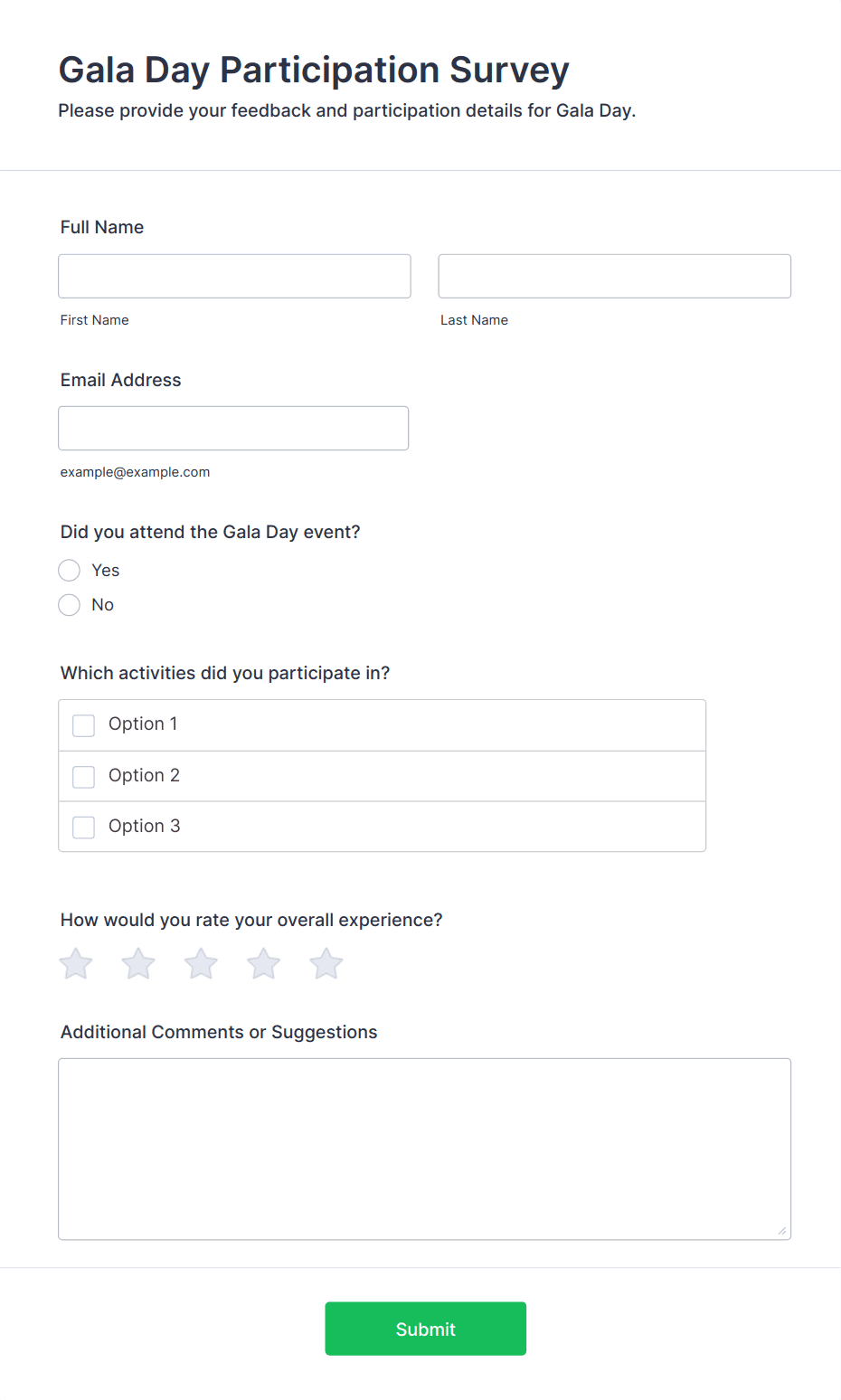 • Rating scales (e.g., 1-5 stars for sessions, speakers, or overall satisfaction)