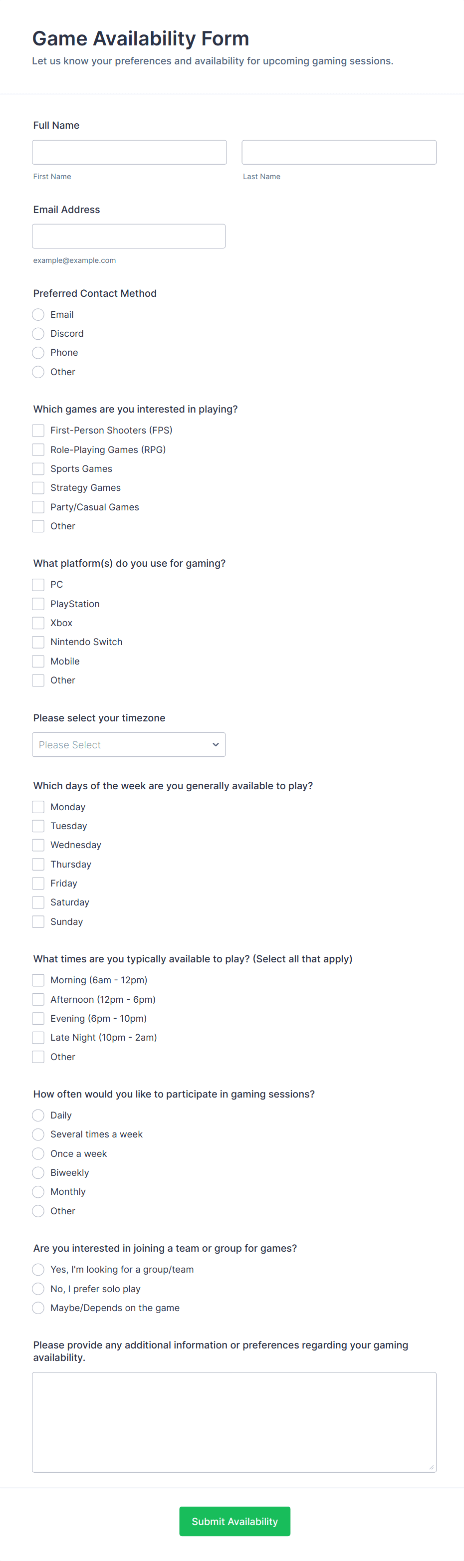 A gaming form template is a pre-designed online form used to collect information related to gaming activities, such as tournament registrations, feedback, event RSVPs, or beta tester applications.
