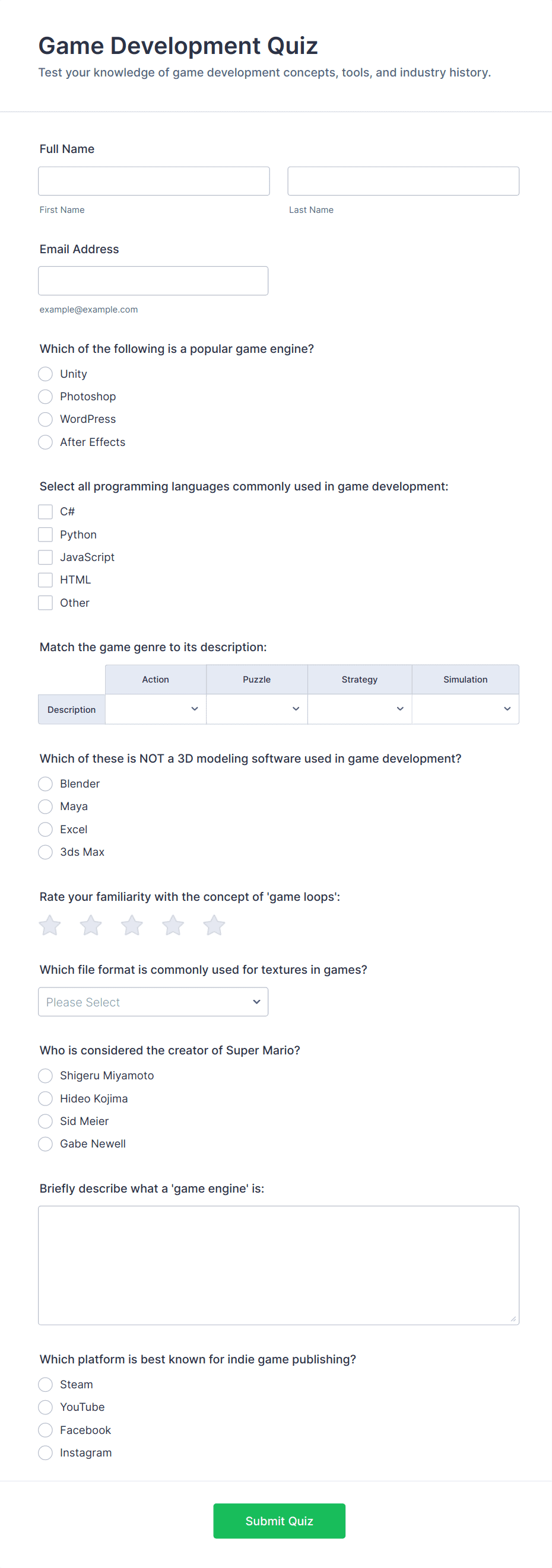 A Trivia Quiz Form is a versatile tool that can be adapted to various contexts and objectives, serving as a fun, interactive, and engaging way to entertain, educate, and connect with audiences.