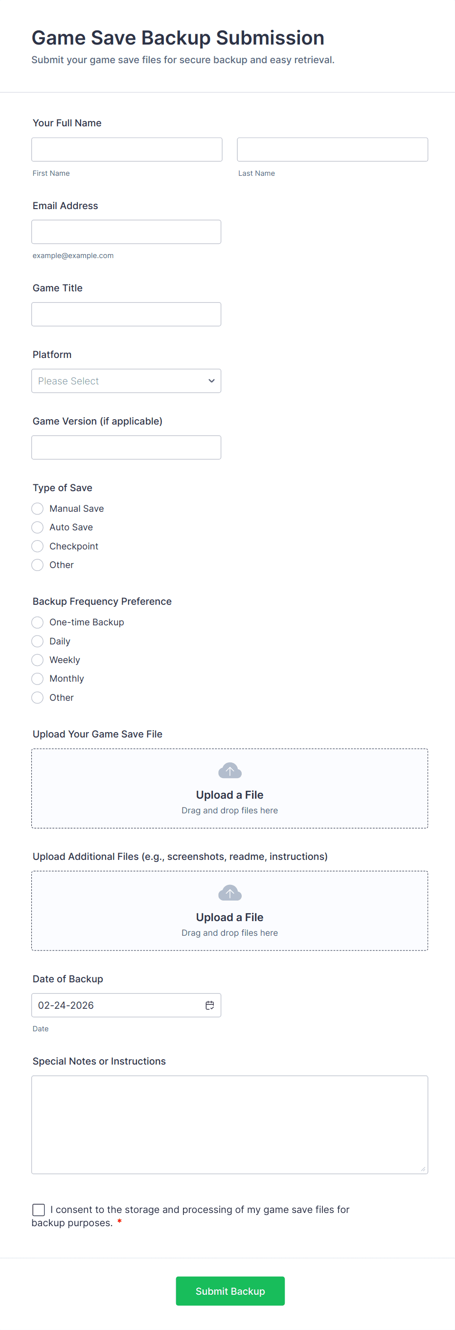 • Support Request Forms: Combine file upload with detailed problem description fields and contact information.