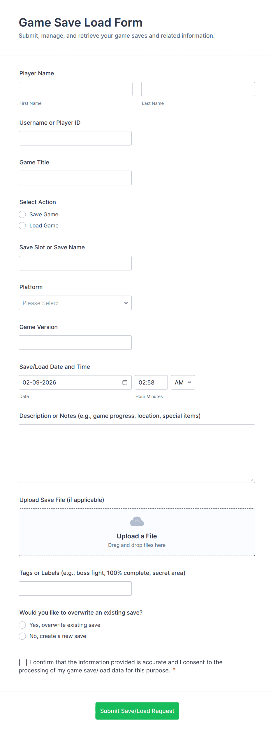 A gaming form template is a pre-designed online form used to collect information related to gaming activities, such as tournament registrations, feedback, event RSVPs, or beta tester applications.