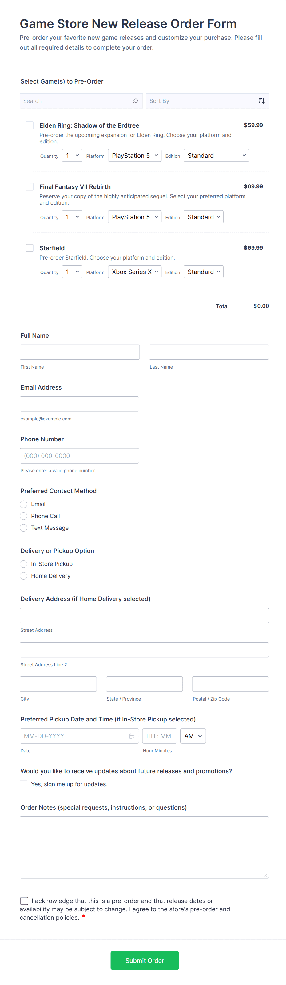 Preorder forms are specialized online forms designed to collect advance orders for products or services before they are officially released or available for general sale. Businesses, creators, and organizations use preorder forms to gauge demand, secure early sales, and streamline inventory planning for upcoming launches. These forms are commonly used for new product releases, limited-edition items, event tickets, seasonal goods, or even digital content. By allowing customers to reserve or purchase items ahead of time, preorder forms help businesses manage expectations, reduce the risk of overproduction, and build excitement around new offerings.