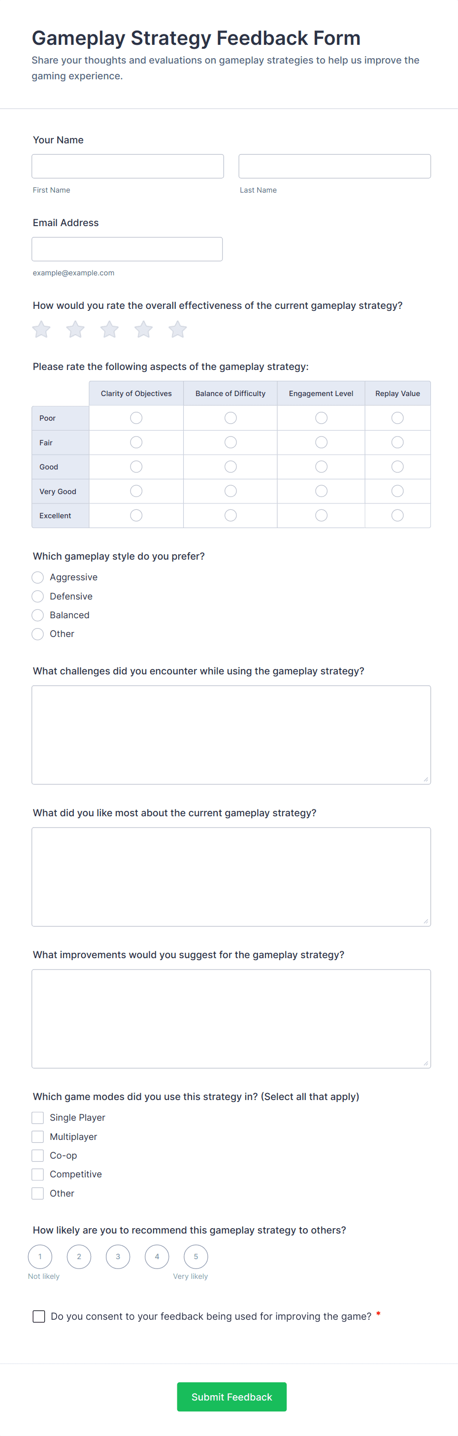A gaming form template is a pre-designed online form used to collect information related to gaming activities, such as tournament registrations, feedback, event RSVPs, or beta tester applications.