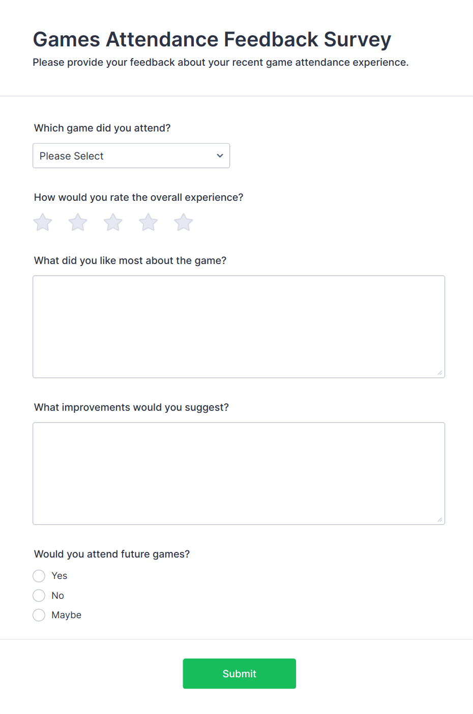 - Open-ended comment boxes for suggestions and detailed feedback