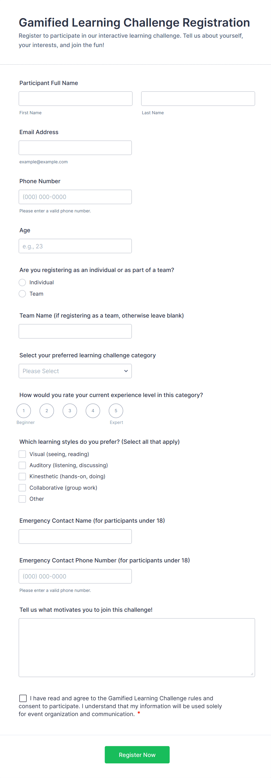 • Workshops and training sessions: Register participants, gather skill levels, and manage waitlists.