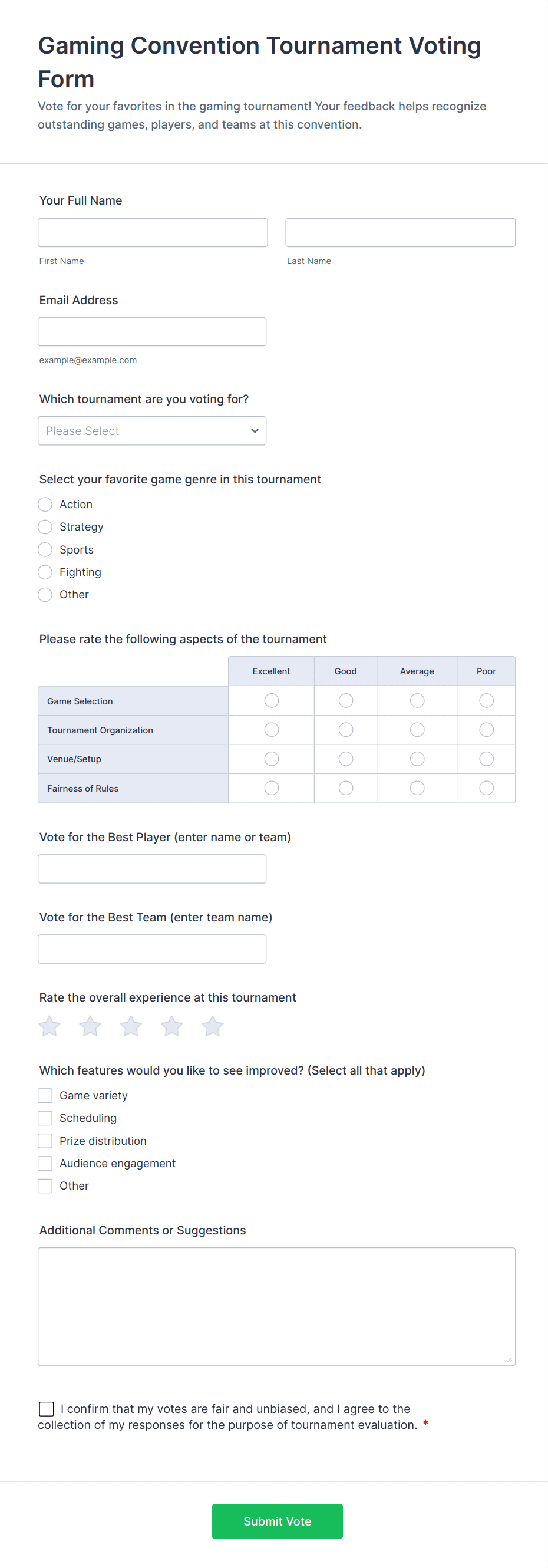 Voting forms are digital tools designed to collect, organize, and analyze votes or preferences from a group of participants. They are commonly used for elections, polls, surveys, award nominations, event planning, and decision-making processes in organizations, schools, clubs, and communities. Voting forms streamline the process of gathering input, whether it’s for selecting a new team leader, choosing a favorite project, or making group decisions efficiently. Their versatility makes them suitable for both formal elections and informal opinion polls, ensuring that every participant’s voice is heard and recorded accurately.