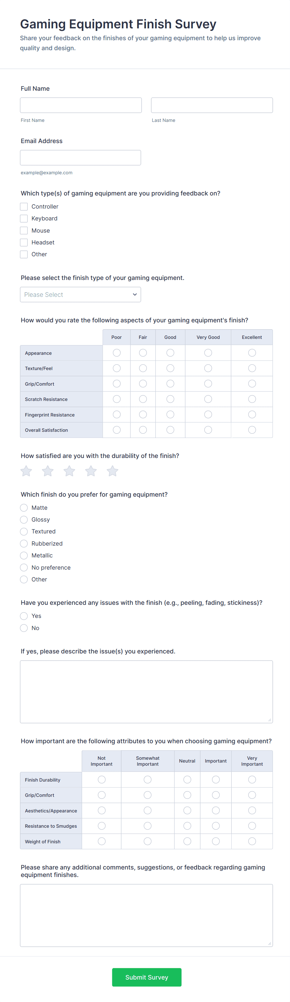 - Multiple choice and rating scales for satisfaction or feature evaluation.