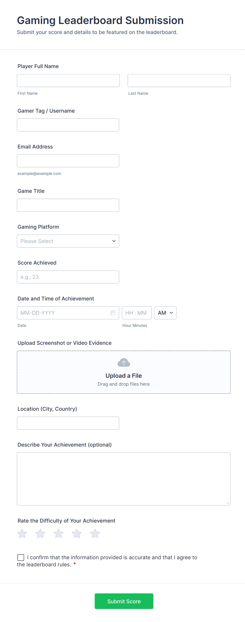 A gaming form template is a pre-designed online form used to collect information related to gaming activities, such as tournament registrations, feedback, event RSVPs, or beta tester applications.