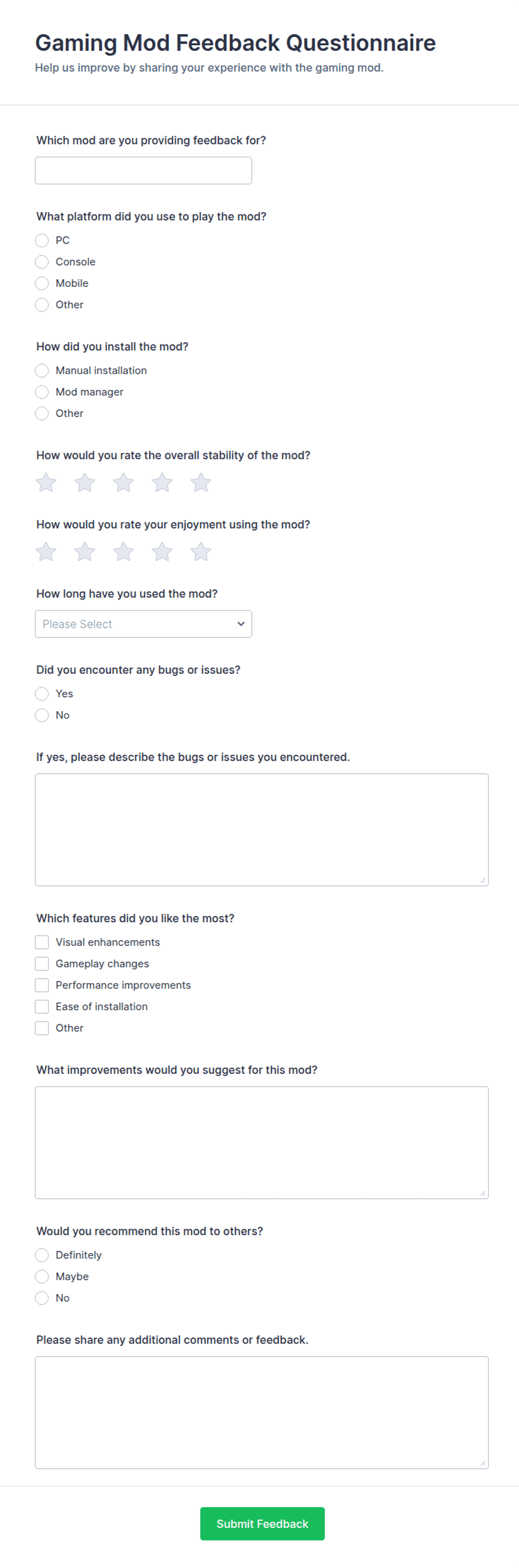 • For customer feedback, include satisfaction ratings and open-ended comment fields.