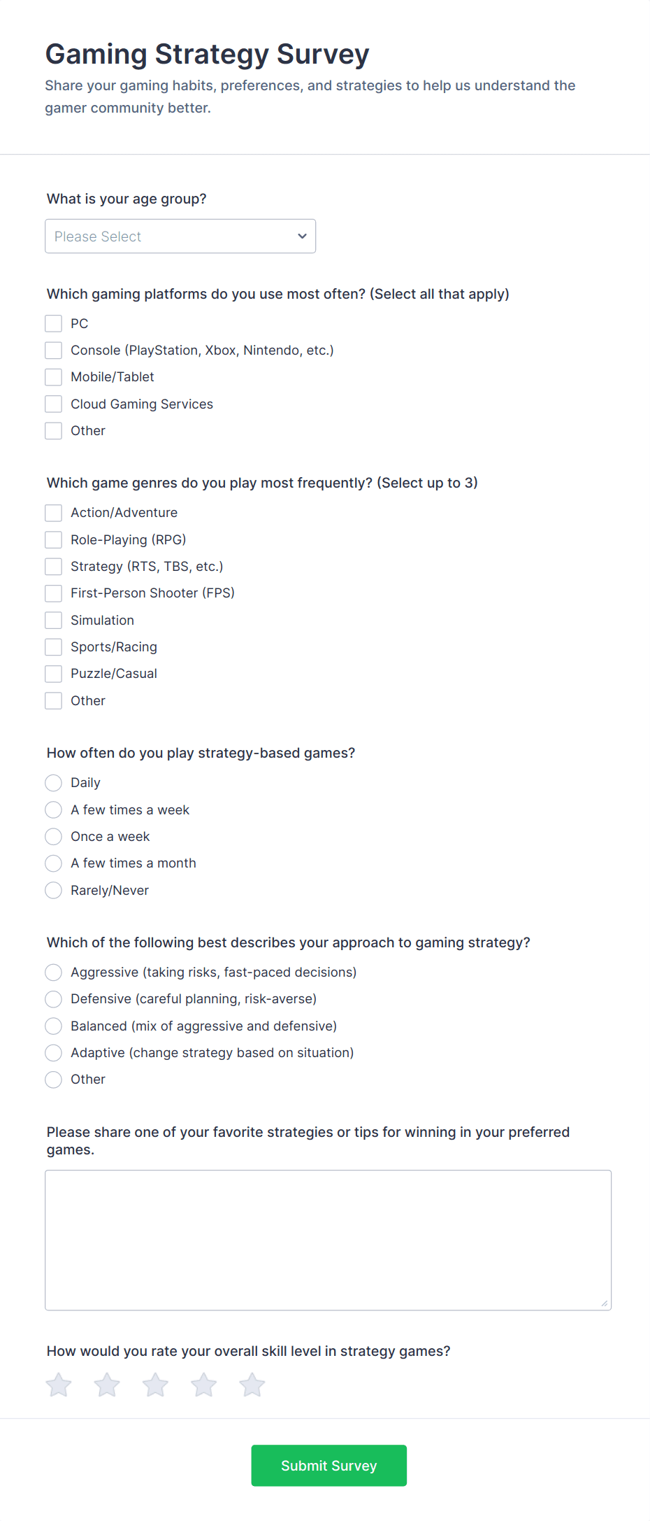 A gaming form template is a pre-designed online form used to collect information related to gaming activities, such as tournament registrations, feedback, event RSVPs, or beta tester applications.