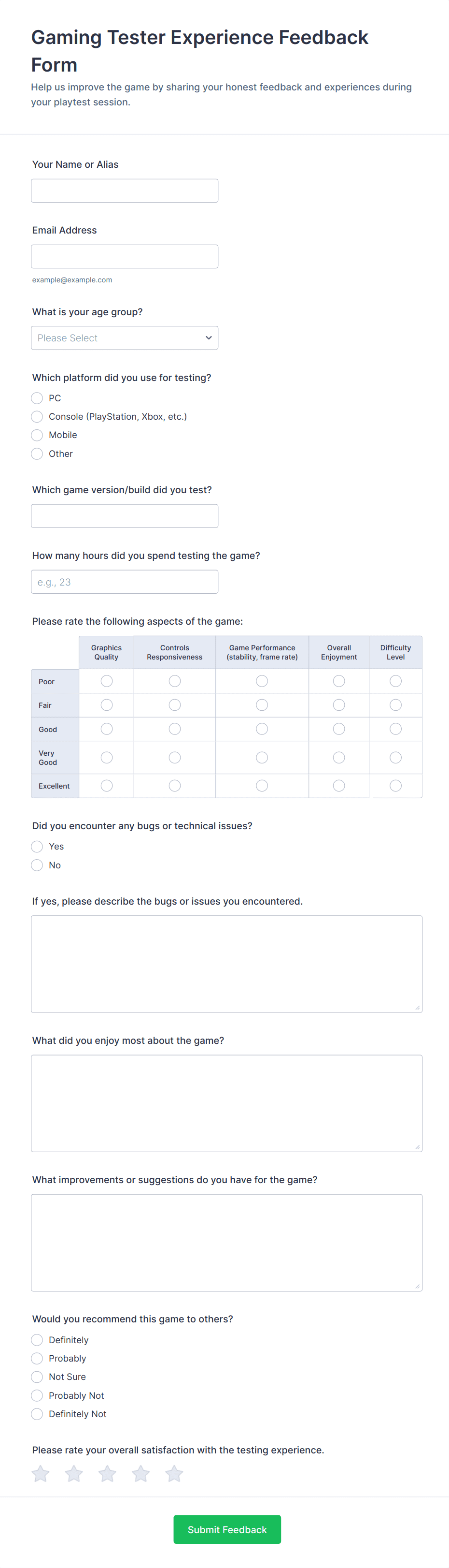 A gaming form template is a pre-designed online form used to collect information related to gaming activities, such as tournament registrations, feedback, event RSVPs, or beta tester applications.
