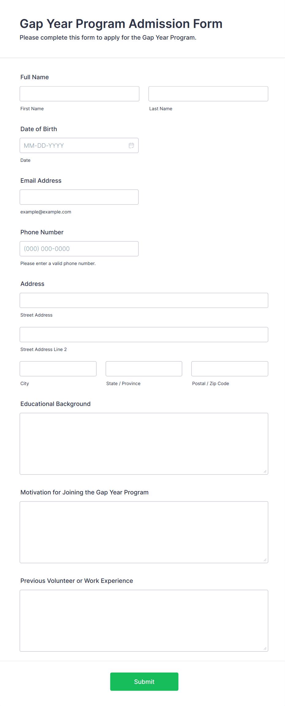- K-12 Admissions: May require fields for grade level, previous school, immunization records, and parental consent.