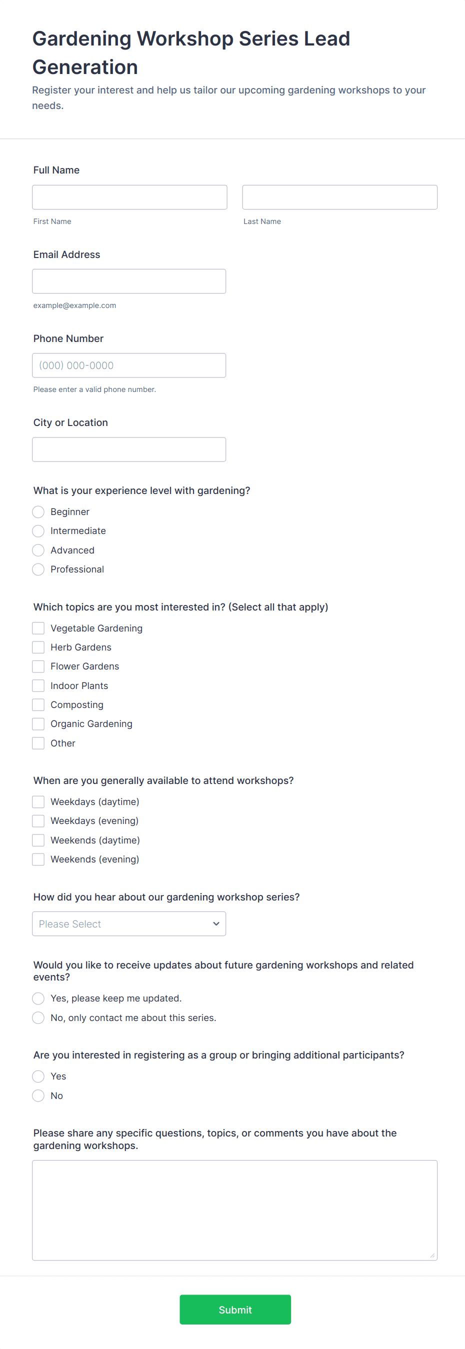 Lead generation forms are specialized online forms designed to capture valuable information from potential customers, clients, or prospects. These forms are commonly used by businesses and organizations to collect contact details, preferences, and other relevant data that can be used to nurture leads and drive sales or engagement. Typical use cases include newsletter sign-ups, event registrations, quote requests, demo bookings, and gated content downloads. By strategically placing lead generation forms on websites, landing pages, or social media, organizations can efficiently gather high-quality leads and streamline their marketing and sales processes.