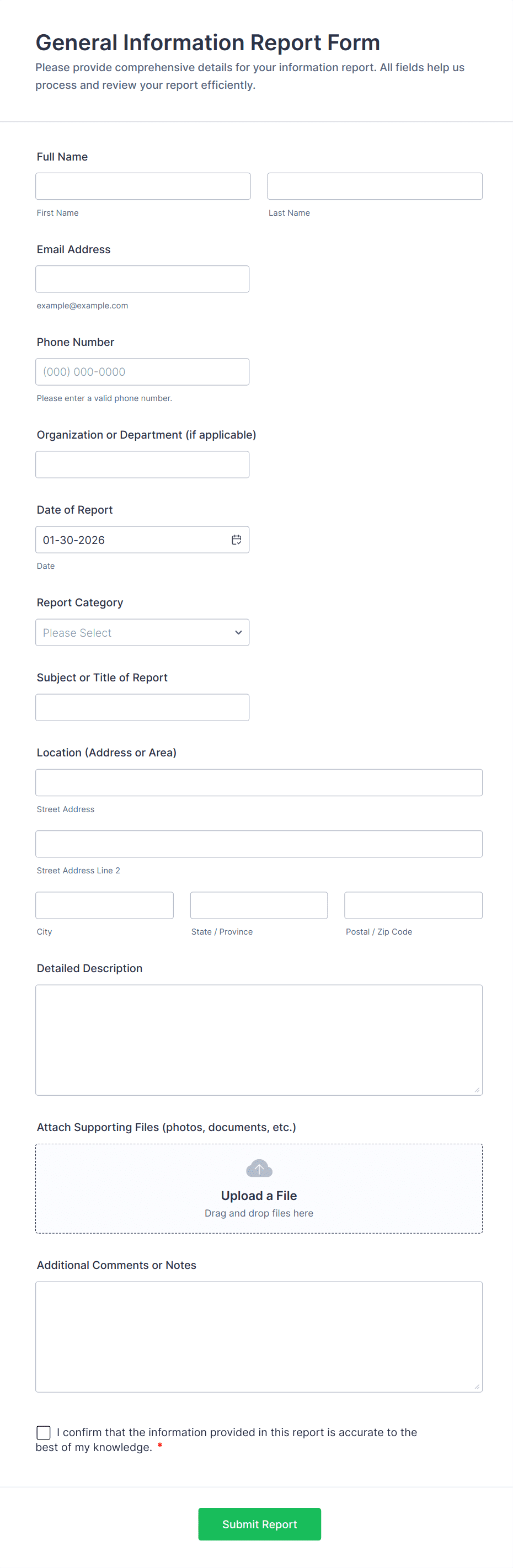 • For business reports: Include fields for dates, metrics, comments, and file uploads.