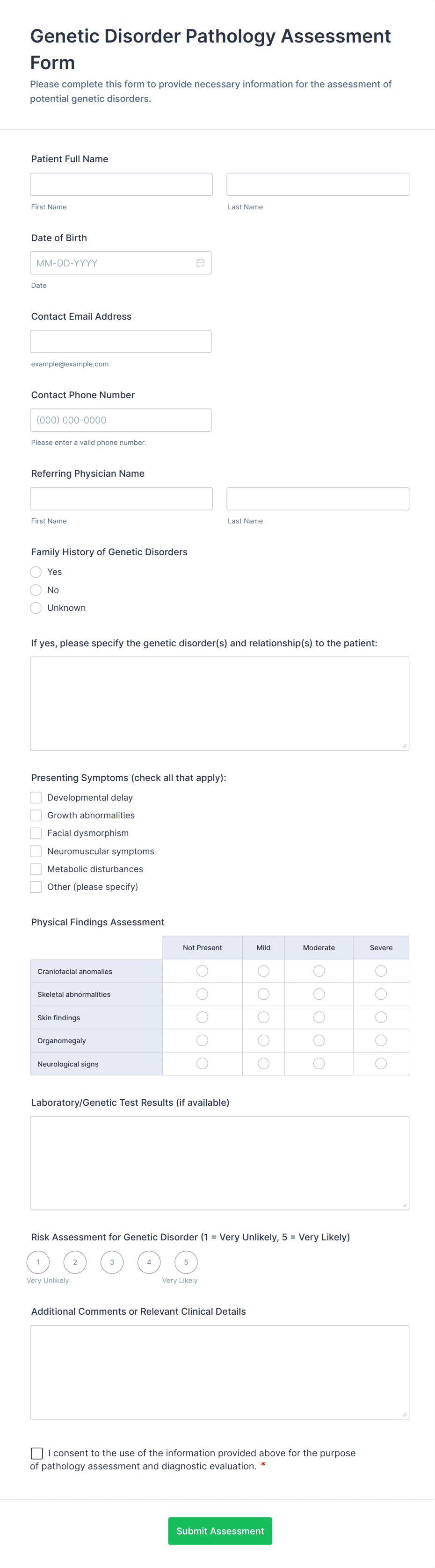 Collect patient name, contact details, appointment type, and reason for assessment. Use dropdowns for clinic department or visit type.