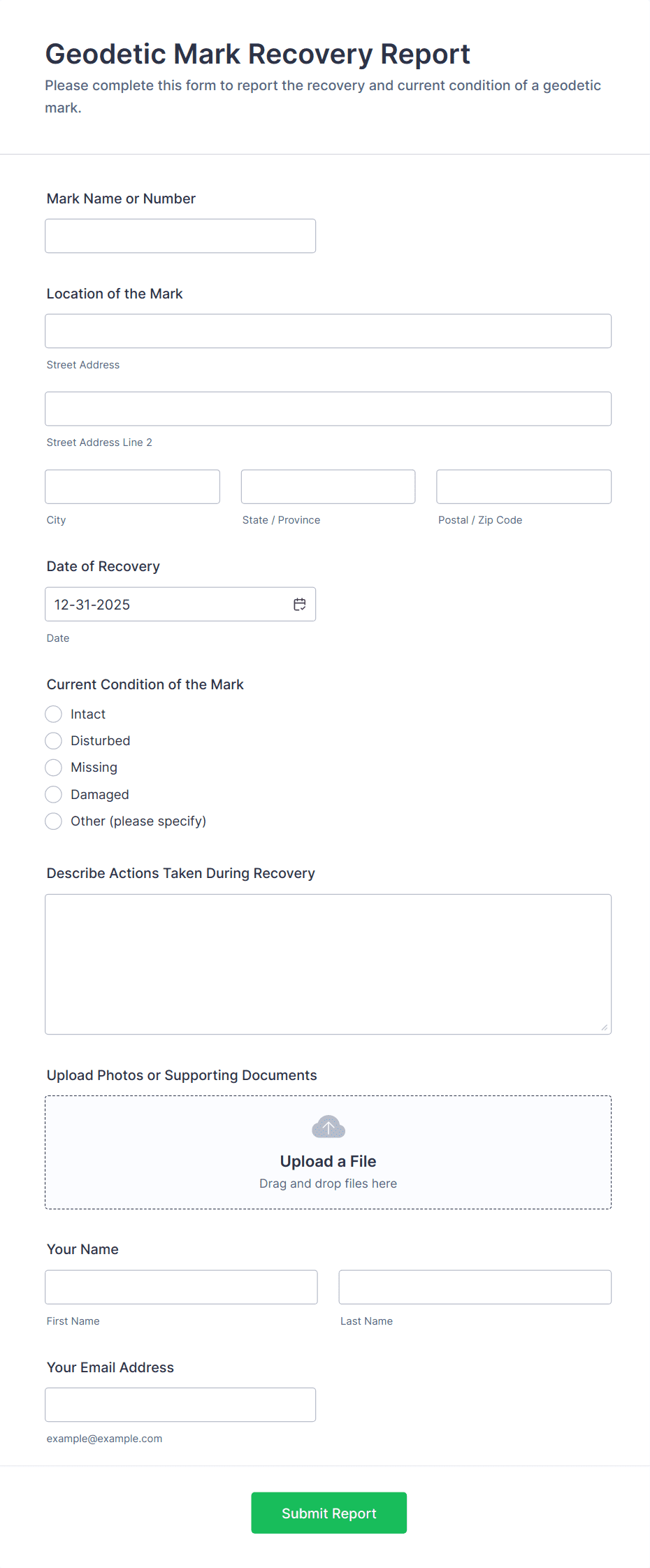 Surveyor forms are used by land surveyors, civil engineers, construction managers, environmental consultants, real estate professionals, and utility companies for a range of data collection and reporting needs.
