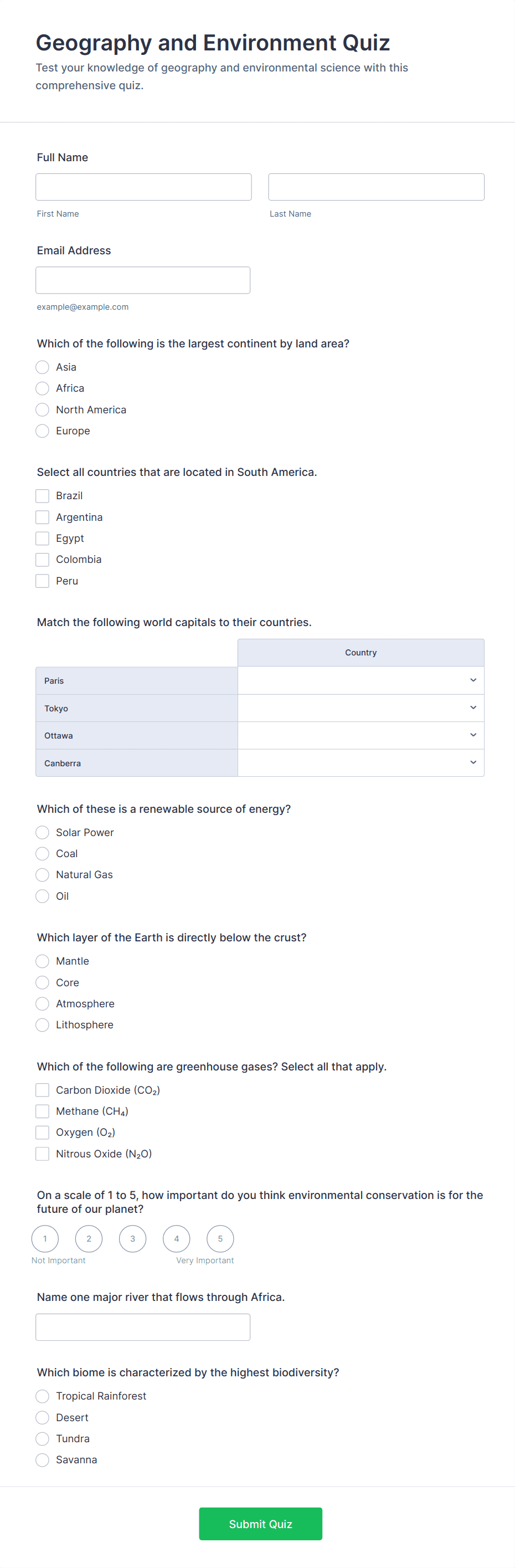 Quiz Templates are pre-designed forms specifically created to facilitate the process of building quizzes for a variety of purposes, such as education, employee training, lead generation, event engagement, and more. These templates provide a structured way to present questions, collect answers, and automatically score or evaluate responses. Whether you’re a teacher assessing student knowledge, a business running a product knowledge test, or a marketer creating a fun personality quiz, Quiz Templates offer a flexible foundation to suit your needs. They can be used for online exams, trivia games, onboarding assessments, customer feedback quizzes, and interactive learning modules.