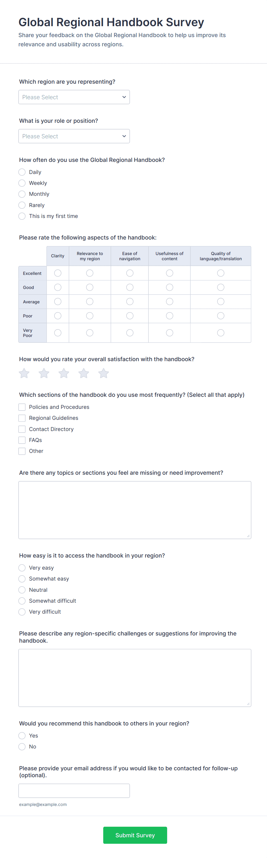 Employee Survey Templates are pre-designed forms that organizations use to gather feedback, opinions, and insights from their workforce. These templates cover a wide range of topics, including job satisfaction, workplace culture, employee engagement, training needs, performance evaluations, and more. By using employee survey templates, HR professionals, managers, and business owners can efficiently collect valuable data to understand employee sentiment, identify areas for improvement, and make informed decisions that enhance workplace productivity and morale. Common use cases include onboarding feedback, exit interviews, pulse surveys, annual engagement surveys, and 360-degree feedback.