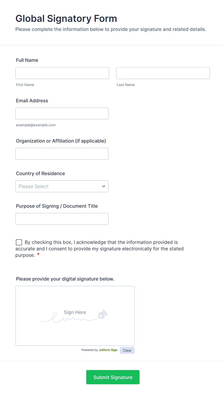 The form templates here are for informational purposes only. Jotform is not providing legal, financial, or other advice, or implying that the forms are legally valid in all or any jurisdictions. Before using any such form, consult an attorney and/or other applicable professionals to make sure that the form meets your needs, legally and otherwise.