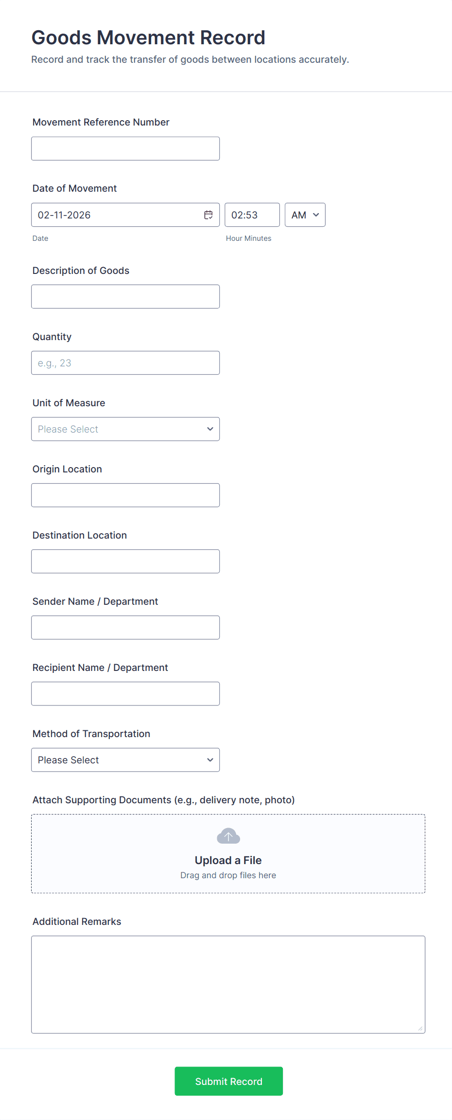 - Inventory Tracking: Forms may include fields for item name, SKU, quantity, location, and restock dates.