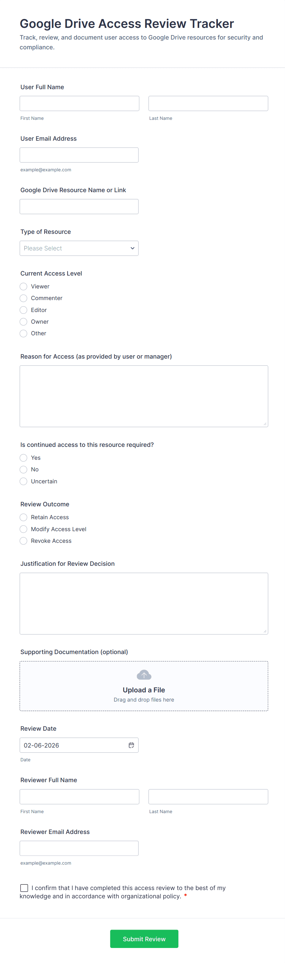Access control forms are structured documents used to request, approve, and document access to physical locations, systems, or restricted resources. They help organizations manage who can enter certain areas, use specific equipment, or access sensitive digital systems by collecting consistent details such as requester identity, access level, justification, and approval records. Access control forms are commonly used in offices, campuses, data centers, hospitals, warehouses, and IT environments for badge requests, visitor access, temporary passes, role-based system access, and permission changes. By standardizing access requests, these forms reduce security risks, improve accountability, and create clear audit trails.