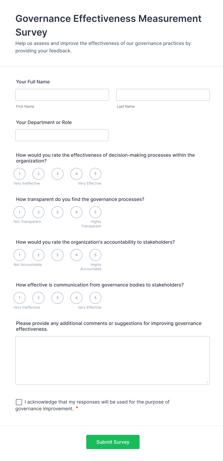 For employee surveys, consider adding anonymity options; for customer surveys, include contact fields if follow-up is needed.