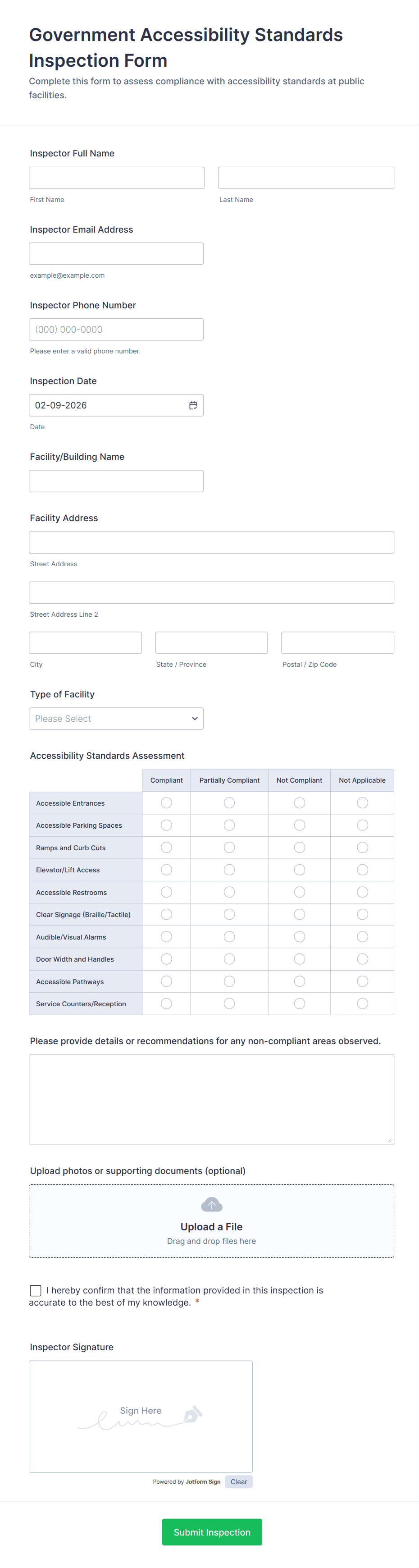 Creating an effective inspection form with Jotform is straightforward and highly customizable, allowing you to address the unique requirements of your inspection process. Whether you’re conducting safety audits, equipment checks, or property walkthroughs, Jotform’s platform ensures your forms are comprehensive, user-friendly, and accessible from any device.