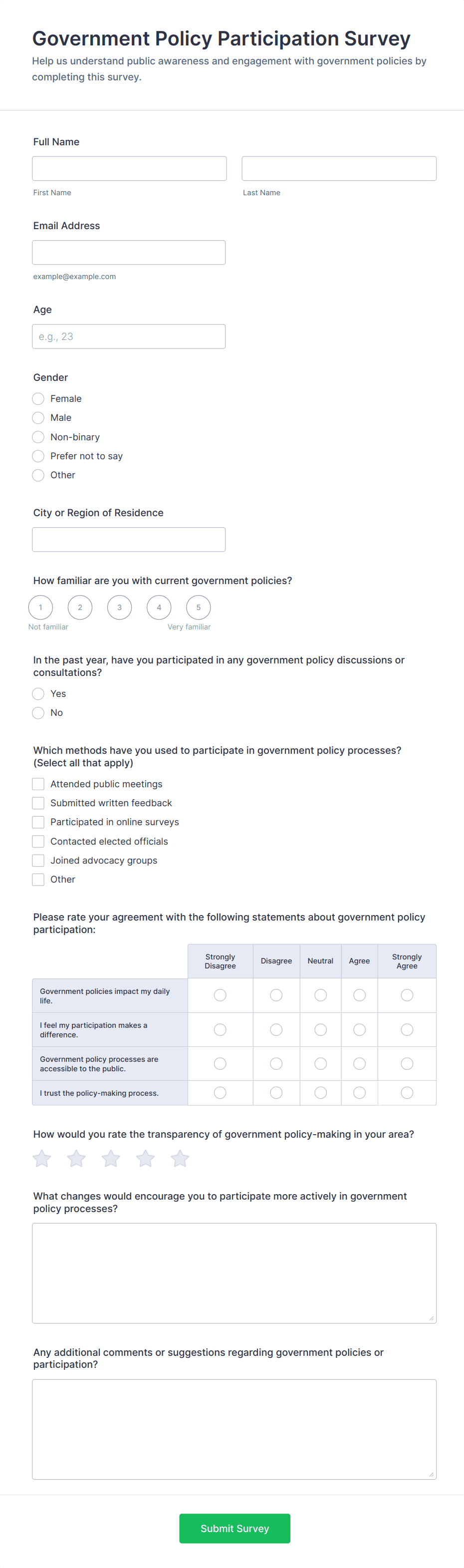 The Public Policy Opinion Survey helps organizations collect valuable insights from citizens on various public policy issues, streamlining data collection and analysis.