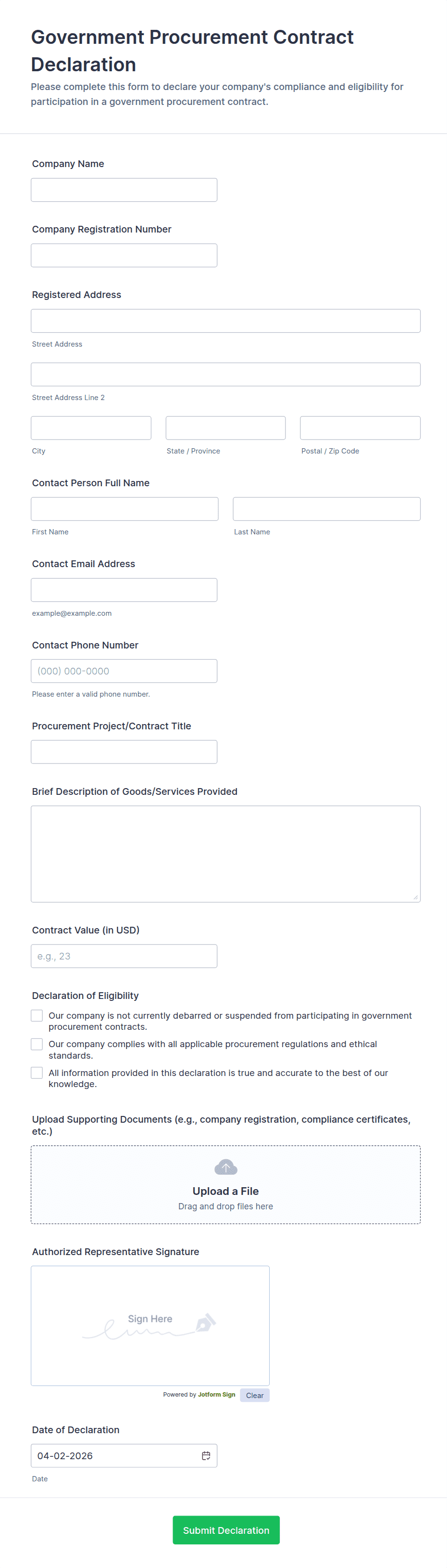 - For legal declarations, add detailed terms and conditions with mandatory agreement checkboxes.