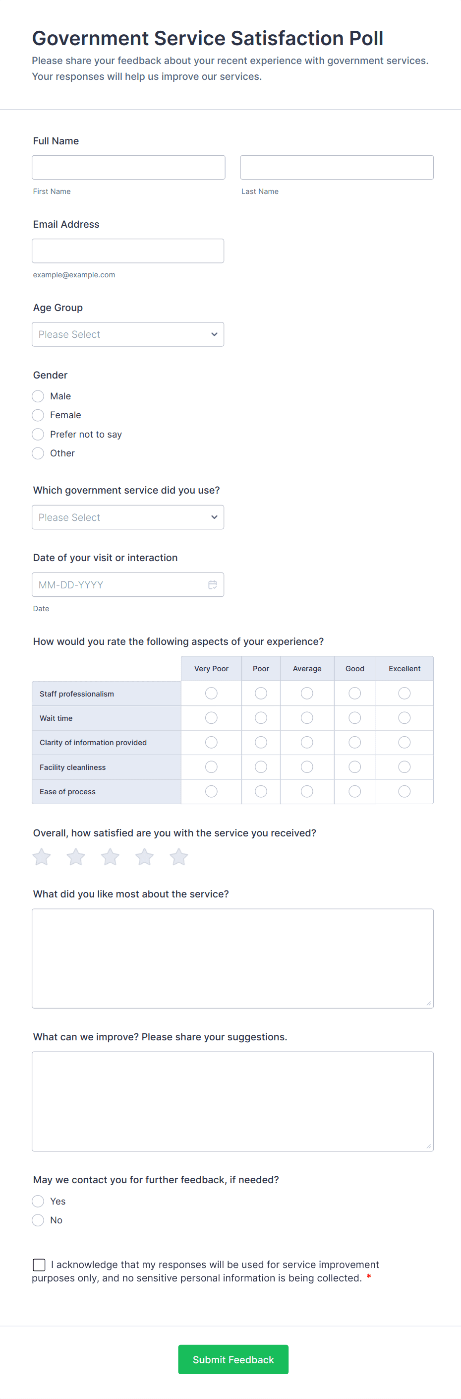 Collect community feedback with the Public Services Awareness Survey in Jotform to measure awareness, usage, satisfaction, and access challenges across regions and demographics for better public service planning.
