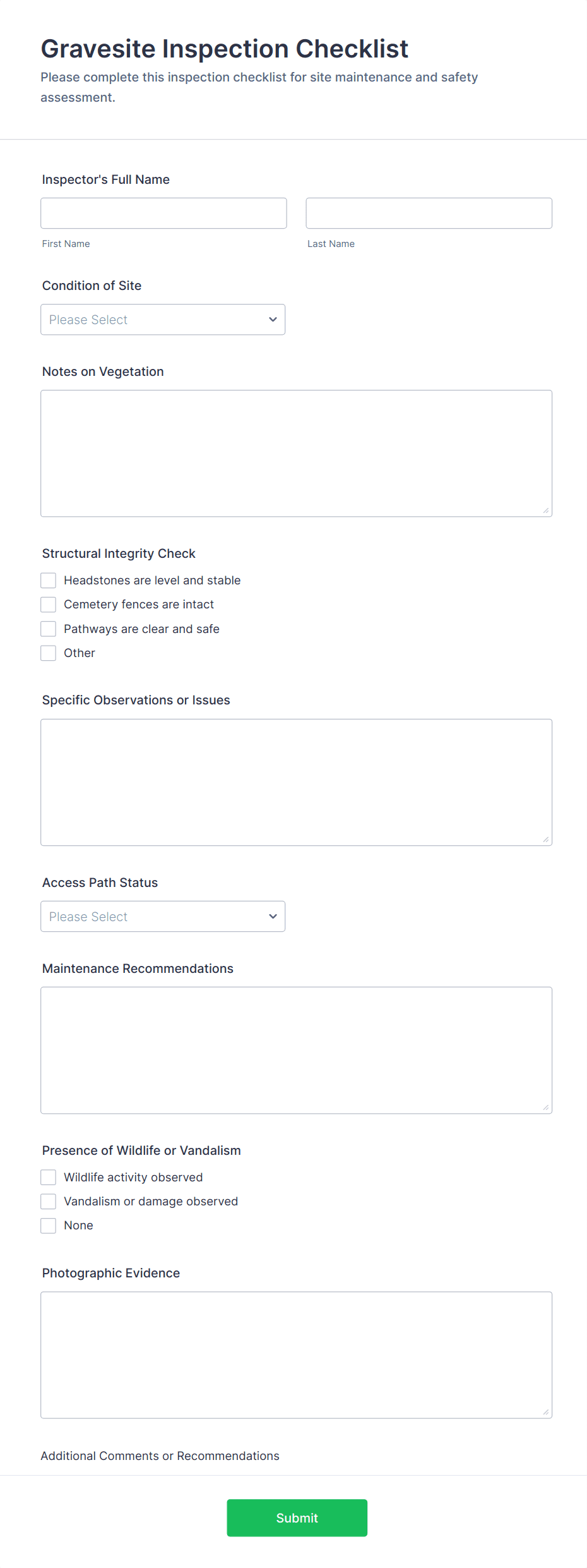 - For construction inspections, add fields for equipment status, safety compliance checklists, and supervisor sign-off.