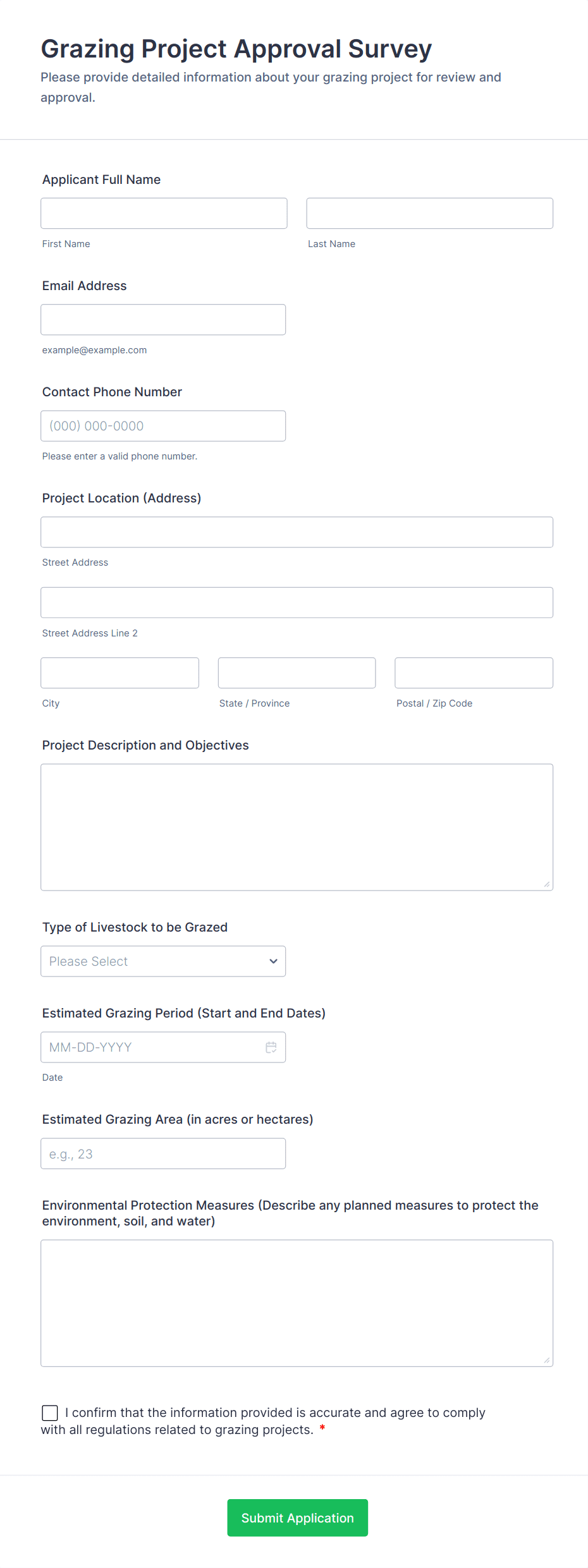 Collect and manage information for your farm with free online Farmer Forms. Whether you’re filling out land lease agreements, selling your products, or collecting worker applications, choose a template below and customize it to perfectly match your needs with our drag-and-drop builder. No coding required! You can then embed your form in your website, share it with a link, or fill it out yourself directly from your smartphone, tablet, or computer. Stop tracking information with pen and paper and upgrade to online Farmer Forms that work great on any device.