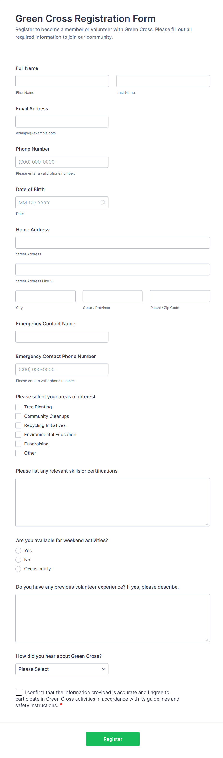 Volunteer Registration Forms are digital tools designed to collect essential information from individuals interested in volunteering for various organizations, events, or causes. These forms streamline the process of gathering volunteer details such as contact information, availability, skills, interests, and emergency contacts. They are widely used by nonprofits, community groups, schools, event organizers, and religious organizations to efficiently manage volunteer sign-ups for activities like charity events, fundraisers, disaster relief efforts, and ongoing community programs. By centralizing volunteer data, these forms help organizations match volunteers to suitable roles, ensure compliance with safety protocols, and maintain organized records for future engagement.